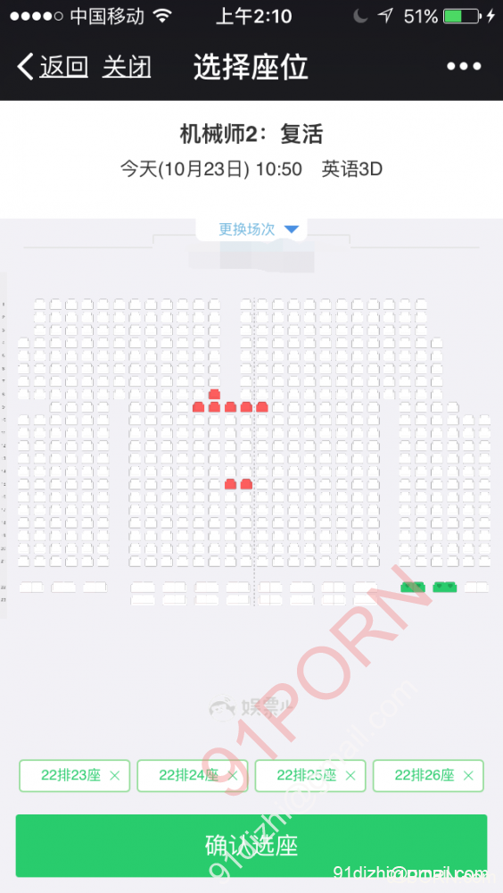為了方便大家的理解,我特意把我們的座位剛才微信又選了一次給大家截圖。這個電影廳很大,而且有情侶座!我們坐的是下圖綠色座位,都是情侶座,我坐左手邊一個人坐一張情侶座,老婆和單男坐另外一張: