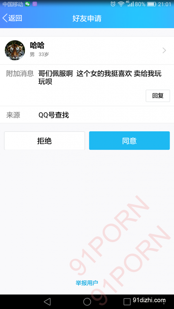 企鹅或者V星加我好友的,起码说一下性质吧,单女、情侣还是夫妻,不说性质也起码说一下加好友目的吧。