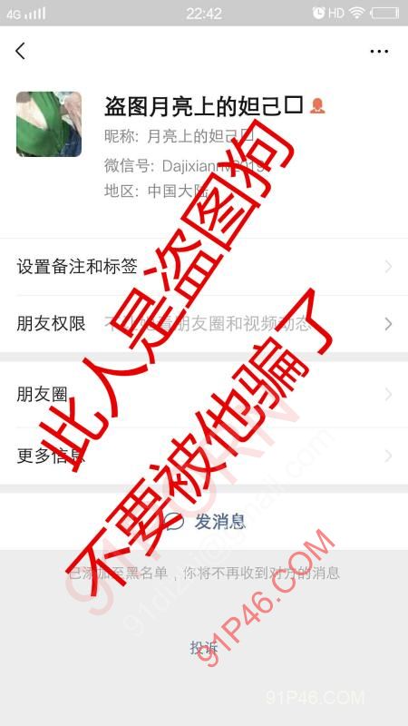 下面这个微信的主人是个盗图者 , 这个人 冒充“91浪妻”, 请大家 注意,不要被这个微信叫 “月亮上的妲己” 故弄玄虚,以假乱真的 骗了, 浪妻网络操作有点弱 她不会翻墙 所以一直没有进去推特,更没有玩过推特 所以下面这个人他现在盗了“91浪妻'以前发在91的图 然后现在他又发在了推特上去冒充“91浪妻” 加人,还各种贼操作,所以91的朋友们 不要被他忽悠了 “清者自清” 谢谢管理 请不要移动板块, 另外 我说明下 “91浪妻的相机坏了”所以很久没有发帖了 有人趁机借她的图 故弄玄虚的 都是冒充她的..... 被忽悠了与我本人无关……