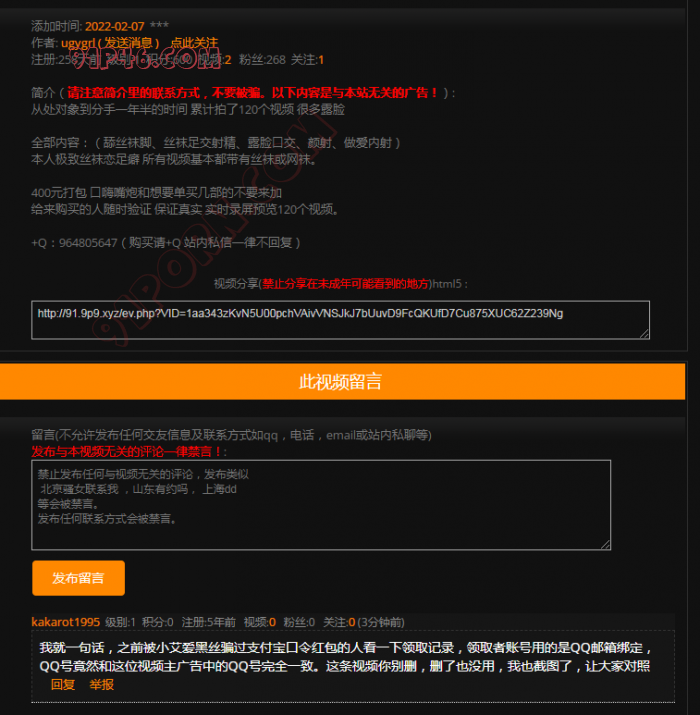 大家应该在视频板块看到过一个名叫“小艾爱黑丝”的用户发布黑丝足交类型,对于喜欢丝袜和足交的狼友有很大的优惠力,不好意思的说我就是其中之一,付款了支付宝口令红包190以后,就消失了,也不拉黑你也不回复你,但就是不理你,再回到板块看到他已经换了Q号,对于这种穷逼我无语了,190元数额不大,也没办法追缴回,但是对于这种败类必须曝光,不要在有其他的狼友上上当了,这个傻逼ID账号也不知道到底有多少,也不知道傻逼管理员怎么管理的, 已经有几十号人加我被这个傻逼骗,居然平台每一个人过问,而且还有缺心眼的二货还在继续被骗中,