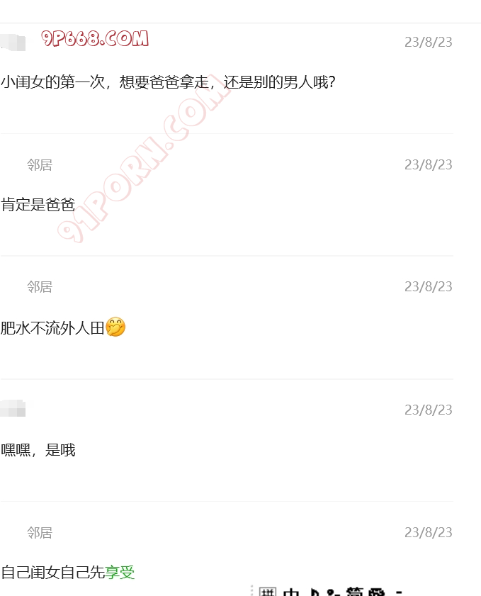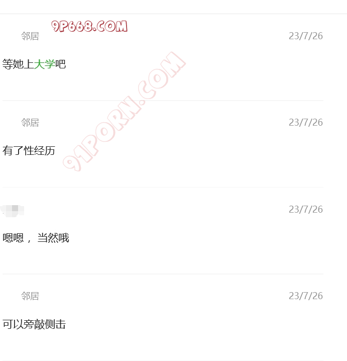 和邻居认识3年了,她单身带闺女和儿子,闺女马上高三了,儿子小学5年级。刚开始只是和她作为炮友相处,后来慢慢产生了对她闺女的想法,开始调教她,开始非常不配合,提女儿就生气,后来慢慢开始配合了,现在特别配合,经常给我带闺女的内裤,做爱的时候让她舔着闺女的内裤。现在闺女高三,等孩子上了大学,开始以妈妈男朋友的身份接触闺女吧,争取明年这个时候能够实现母女双飞。关于聊天记录的称呼,我一直叫她大闺女,叫她闺女小闺女。
