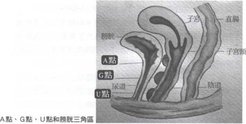 三者从外到里依次是U点、G点、A点,连成一条线。而且几个点都有一定程度的左右变异,实际上也就是解剖学所说的,大概是膀胱三角区的位置。这个区域的神经分布肯定是很密集的,其感觉自然也就很敏感了。