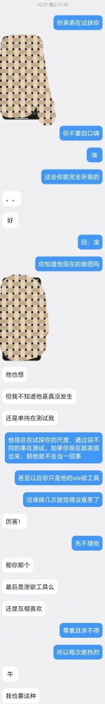 在这个时候,别说小姐姐,连旁观者的我都看的硬邦邦,恨不得现场围观。但是我们要掌控剧情的发展,很幸运这个小姐姐愿意配合且很聪颖。知道掌控局势的重要性。继续打压弟弟,眼看弟弟没当回事,姐姐直接说要搬出去,这下弟弟就慌了,知道姐姐真生气了,立马道歉认怂。小样,这就是拿捏住荷尔蒙,就拿捏住了弟弟