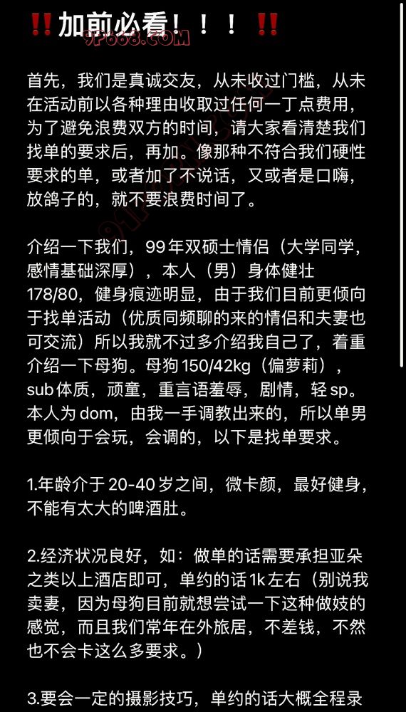 请看好我发的要求图!!!看好再加!!!谢谢!!! 我们活动经验很少,一共有过3个单男,5次单约,3次3p,以前从未被放鸽子,口嗨过!最近发了上条贴,加了很多单男,被口嗨一次放鸽子一次,希望大家看好在家,我们真诚交友,避免浪费双方时间。