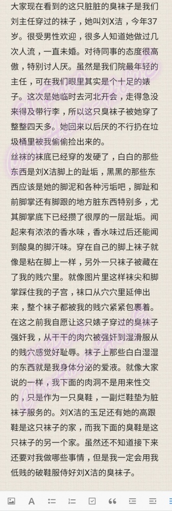 当臭袜棒逐渐深入体内,袜尖紧紧的抵住花心的那一刻忽然有一个声音在脑内盘旋:“刘主任的臭袜子在强奸我,刘主任的臭袜底在踩弄着我的肉壁,刘主任的脏趾垢在污染我的子宫...”再想起之前的任务宣言....还没等高潮,巨大的屈辱和羞耻让我弯过手臂遮住脸哭了出来....