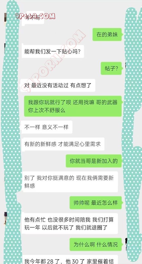 大家可以先看看聊天记录,我记得第一次认识的时候直接给我口射了,爆了她一嘴,当时还挺不好意思的,我年龄大了,受不了,但是当晚还是干了她三次。还在一起开发三洞齐入,多人玩,尤其是开肛的时候,疼哭了,其实蛮心疼的,眼泪流出来心疼死了,那时候她也才25吧应该是,粉粉嫩嫩 白白的,真的玩的非常的爽,叫爸爸,有一个那个m表,太变态的就不算了,基本上都画上对号了,最后玩一年了,马上结婚了她,以后圈里就又消失了一对优秀的情侣。但是也不一定,就她这个瘾,有可能生过小孩也要出来玩。